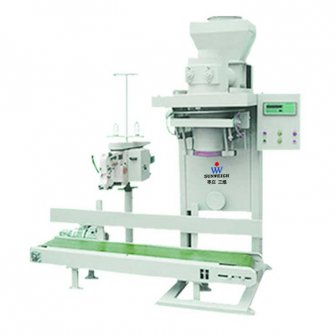 DCS-50F定量包裝秤為半自動操作,生產(chǎn)過程中需要人工將包裝袋套入下料口,撥動夾袋開關(guān),控制系統(tǒng)接收套袋信號后驅(qū)動氣缸將包裝袋夾住,同時啟動給料機構(gòu)料倉物料送入包裝秤,送料機構(gòu)給螺旋送料,達到目標重量時,送料機構(gòu)停止,包裝袋自動落到輸送機上,由輸送機將包裝袋往后輸送進行縫口,完成一次裝袋過程。