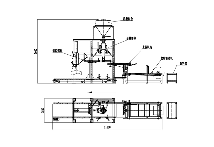 全自動機器上袋氧化鋁噸袋包裝機主要機構:氧化鋁空袋輸送機構、自動上袋機構、氧化鋁自動稱量機構、氧化鋁自動灌裝機構、自動熱合封口、自動噴碼打印、氧化鋁自動輸送機構。簡略圖紙如下: